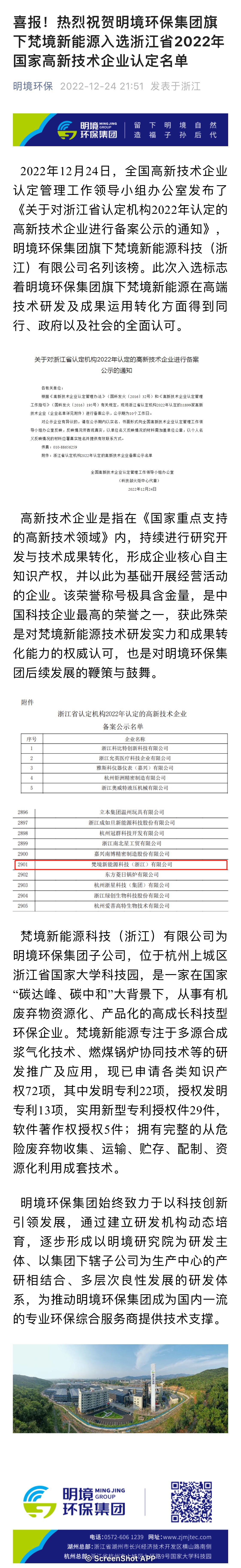 喜報!熱烈祝賀明境環(huán)保集團旗下梵境新能源入選浙江省2022年國家高新技術企業(yè)認定名單